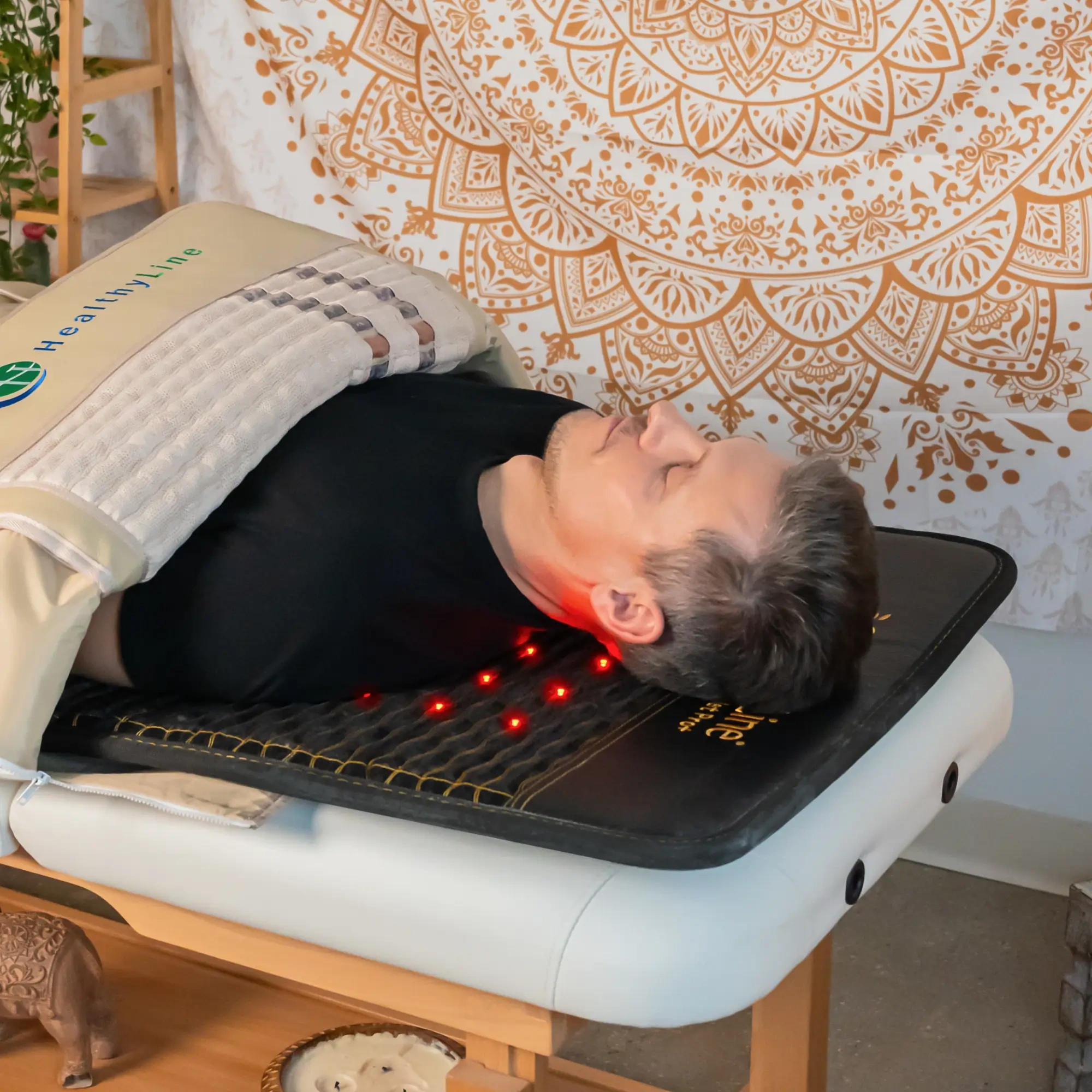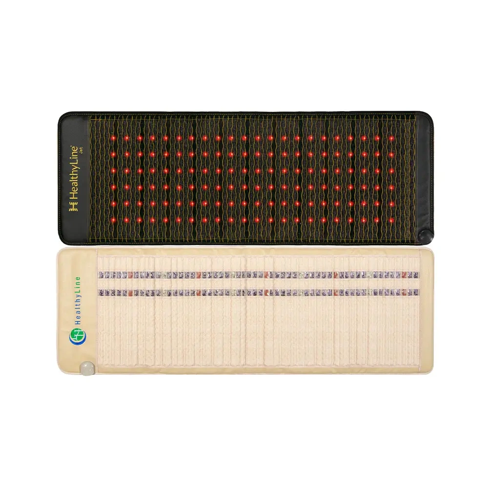 The HealthyLine JET Series 360 Wrap Set is a full-body far infrared sauna wrap system that combines two coordinated mats to deliver wraparound coverage for clinical and spa environments. The Jet mat provides deep pulsed electromagnetic field (PEMF) therapy up to 8 gauss with 0.25-30 Hz frequency range and integrated 660 nm red light, while the SOFT mat functions as a gentle heated infrared wrap. Both mats use layered construction with up to 21 functional layers and EMF shielding, and contain jade, amethyst, tourmaline, and obsidian gemstones to support heat distribution. The set measures approximately 72 x 24 inches and 74 x 28 inches with dual 220W power inputs and independent time and temperature controls for flexible treatment protocols. Read more